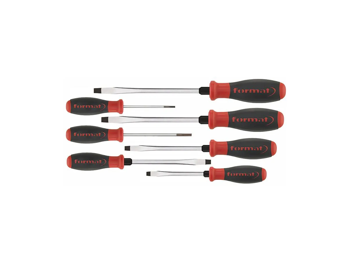 Slot screwdriver set 7 Pcs, Made of high-alloy special steel. Hexagon blade with hexagon wrench and special coating for more torque and fit. With Kraftkant® handle, ergonomic, with integrated soft zones and roll-off protection.