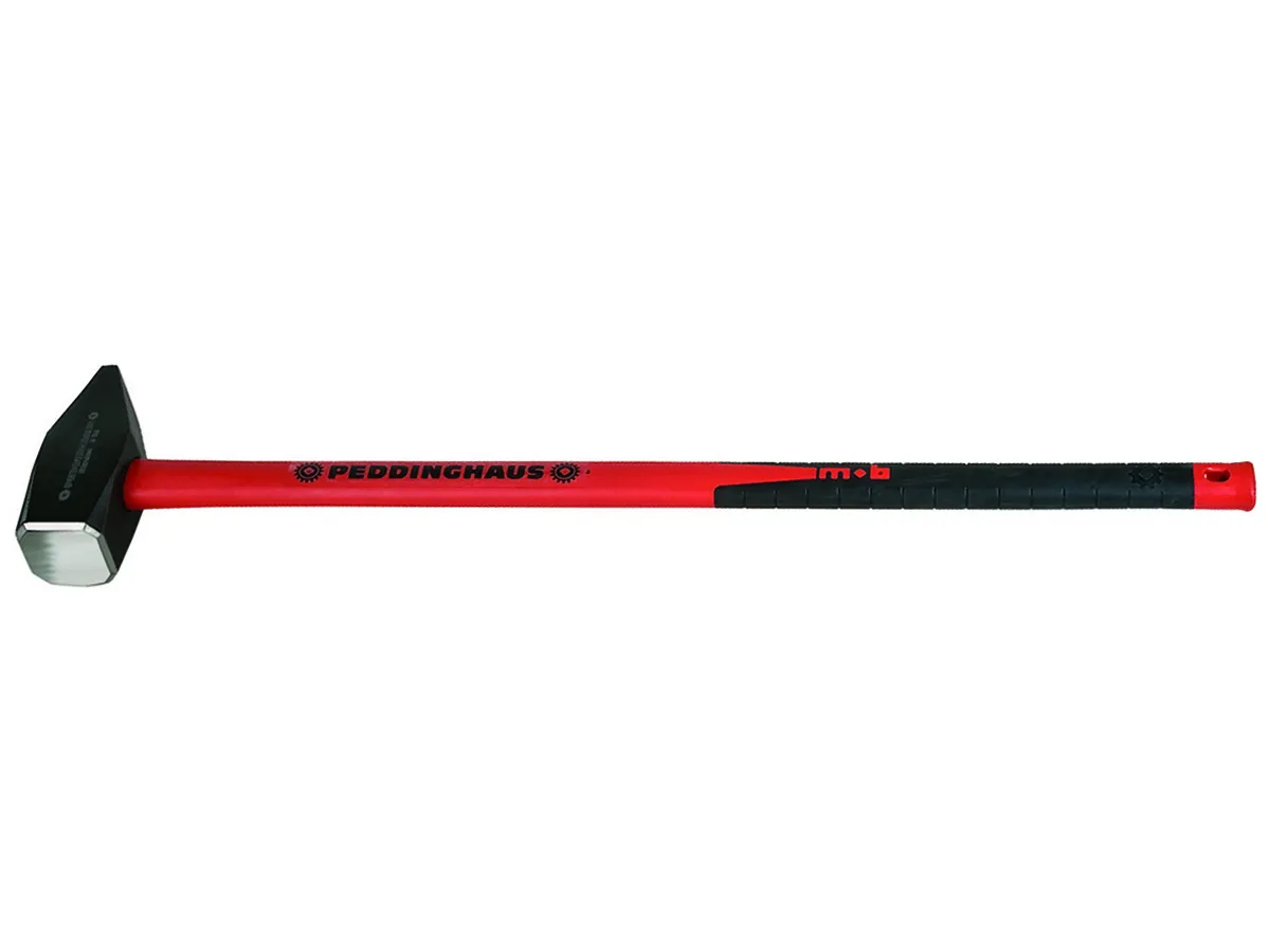 Sledgehammer, Forged from high quality steel, hardened and tempered in accordance with regulations. Multi-component handle with fibreglass core, inextricably connected to the hammer head by pressing the handle. Non-slip handle end, fibreglass core, coated to prevent vibrations
